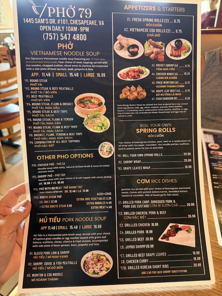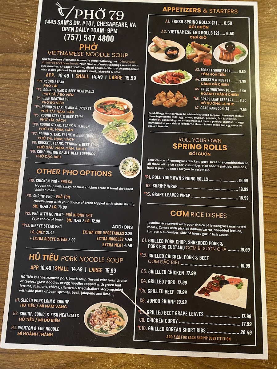 If you're in search of a cozy spot that serves up delicious, hearty meals with a smile, Pho 79 is more than just a restaurant; it's a culinary retreat. With a clean and traditional decor, along with options for outside dining, it offers a delightful atmosphere to enjoy every bite. So gather your friends and family, and indulge in a taste of Vietnam right here in Chesapeake!
